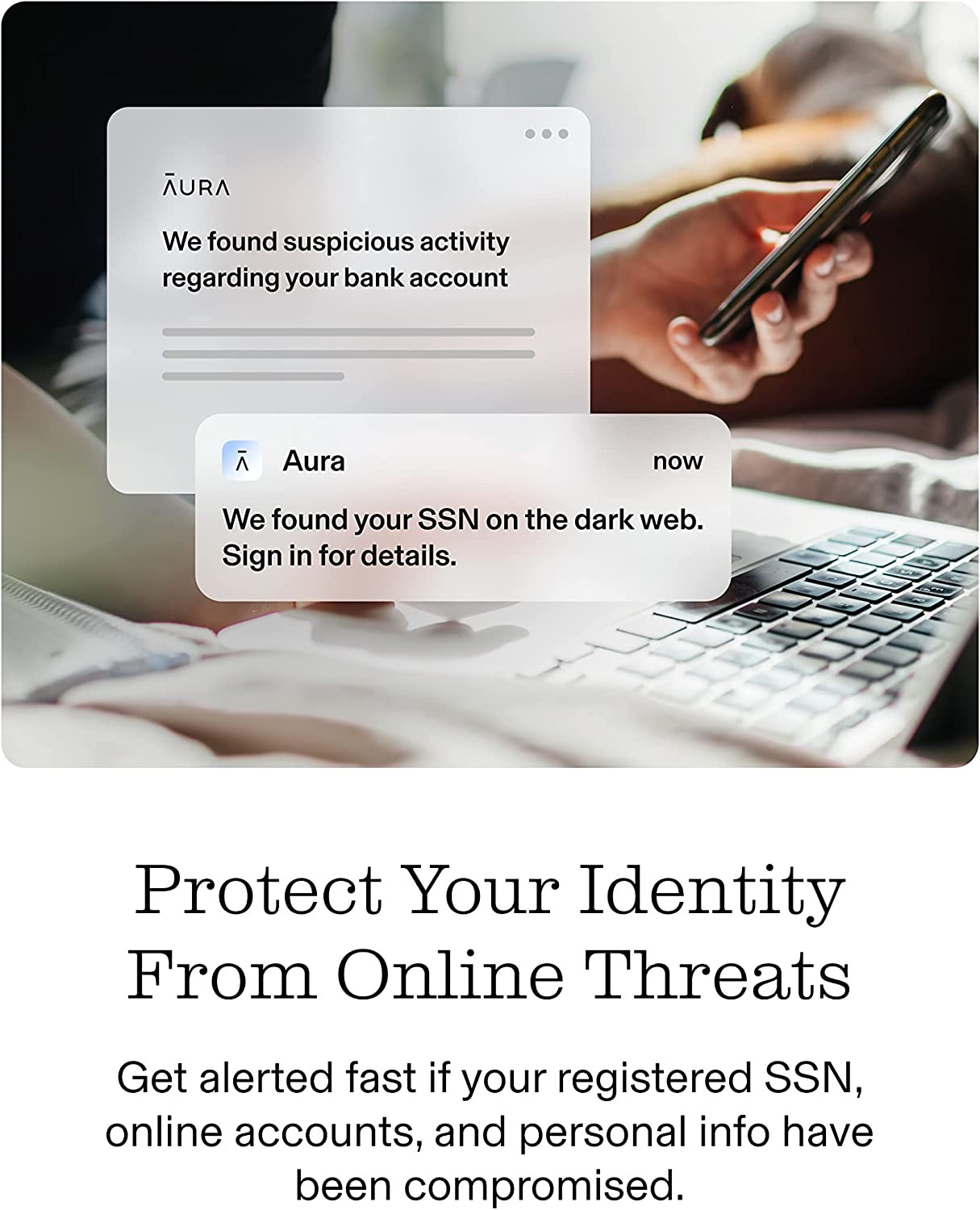 • PROTECT YOUR PERSONAL INFO: Aura alerts you if your most sensitive information has been compromised online and is found on the Dark Web.
