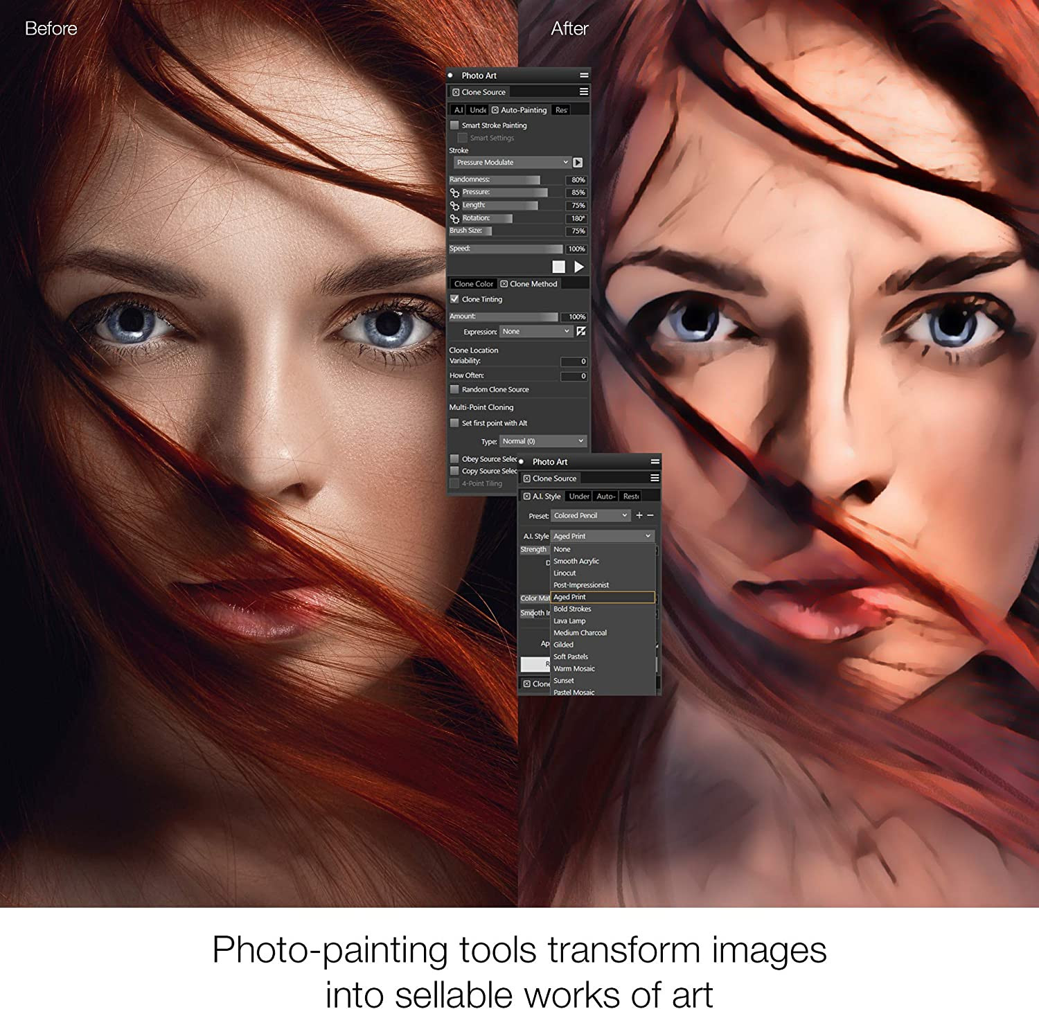 Transform favorite photos and drawings into breathtaking paintings: stylize any image using artificial intelligence and easily transform imagery into paintings with powerful Auto-Painting and cloning tools