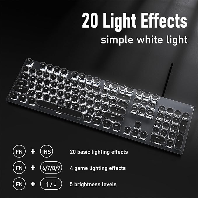 • Metal Panel & White Backlit: The light-up keyboard panel is made of high-quality aluminum alloy, with a smooth and delicate surface, and texture, easy to clean and scratch-resistant. The unique white light design makes the black wired keyboard so aesthetic and cool, with 19 preset light effects (Press FN & INS/6/7/8/9/0), 5 brightness, and breathing speed (Press FN & Arrow Key). When the backlight is turned on, the cool gaming mechanical keyboard ainstantly looks brand new and awesome bright