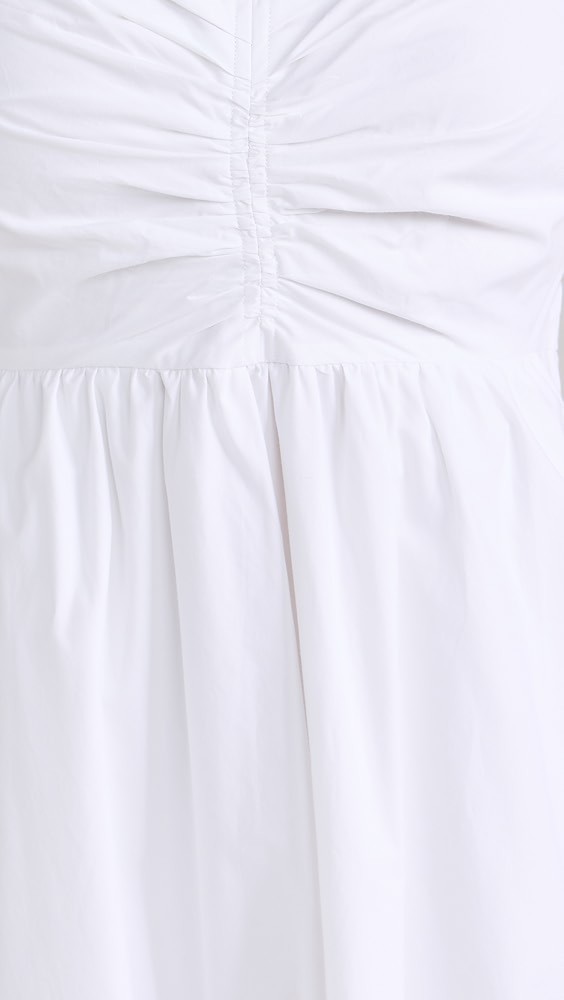 Designed with an A-line silhouette and midi length. Poplin fabric has a smooth, cool hand. Fashion tape may be used to secure the shoulder straps.
